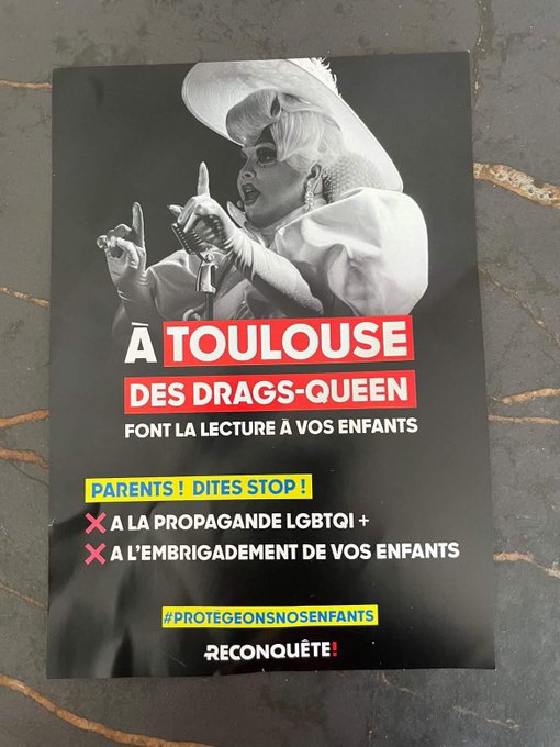 4 février. L’artiste La Briochée voit son image récupérée par Reconquête pour un tract LGBTIphobe, elle portera plainte. Nous voyons qu’outre les groupuscules, Reconquête se saisit pleinement de cette thématique.