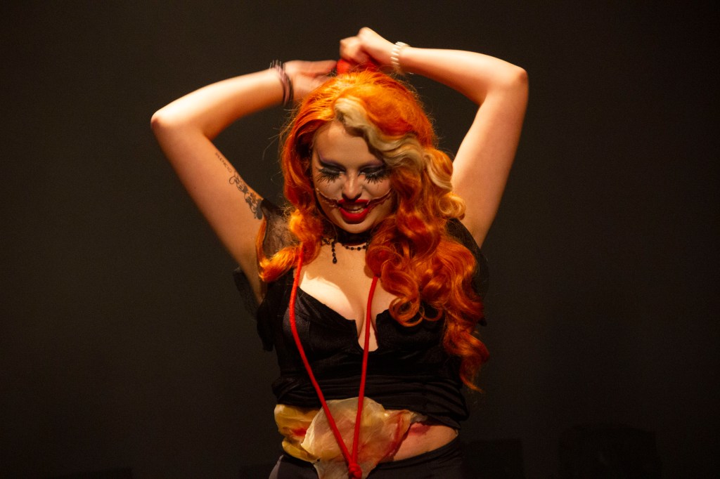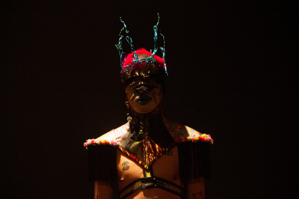 Les artistes drag présenté-es dans cette exposition sont issu-es majoritairement de la scène française, qui nous offre un panel pertinent de choix esthétique et de démarche particulière. De la drag féminine comme La Méandre ou Sheinara Tanjabi, aux drags club kids comme Daemon Schiele et Sébum, en passant par l’utilisation de retouches photographiques chez Sasha Kills, nous entrevoyons la richesse des représentations possible dans l’univers du drag. Nous avons dédié un mur aux drag kings, qui sont ici des femmes travesties en hommes et nous proposent des points du vue sur la masculinité.