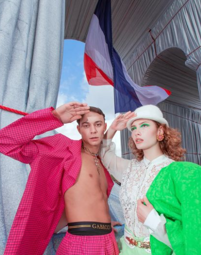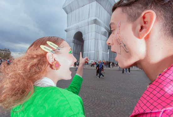 Oihana Marre crée un espace hors du temps, qui semble se défaire de toute accroche à la réalité commune. Si on revient sur le shooting « TOURISTA » on retrouve ces deux modèles qui courent, ivres d’enthousiasme, monochromes dans un kitsch de touristes parisiens accompagnés de leur Tour Eiffel de strass au visage mais aussi en accessoires. Iels se mêlent à la foule, sans problème, elle se presse autour de l’équipe pour regarder, prendre des photos amateures, admirer la mise en scène. Par la sublimation du vêtement, les images d’Oihana Marre témoigne aussi de l’envie irrépressible des touristes pour la capitale, pour ses grands monuments, ou plutôt en la résumant à ses grands monuments. Cherchant leur photographie, leur selfie devant la Tour Eiffel, l’Arc de Triomphe. Nous pouvons faire un parallèle entre le scandale par rapport au prix de l’empaquetage de l’Arc de Triomphe, dénoncé comme une dépense inutile, caractéristique d’un monde de l’art sans limite dans le gigantisme ; et le milieu de la création de mode, de la haute couture, qui reste un monde où règnent l’argent, l’étalement des richesses sur soi-même. Dans la réalité l’installation de Christo et Jeanne-Claude a bien coûté 14 millions d’euros, mais c’est leur propre fondation qui a payé tous les frais, et les vêtements présentés par Kendall sont soit créées soit issus de boutique de seconde main.