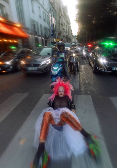 A propos des déformations corporelles on peut revenir sur son shooting avec la drag artist Schlampakir von Fickdich. Nous soulevons un point intéressant : mettre le drag dans l’espace urbain, dans le milieu du jour (nous reviendrons dessus lors d’une prochaine publication). Nous avons là des déformations qui rendent le corps irréel, on se rapproche de Unheimlich de Freud sur deux notions : celle du genre avec le modèle drag, et l’humain avec les extensions des membres.